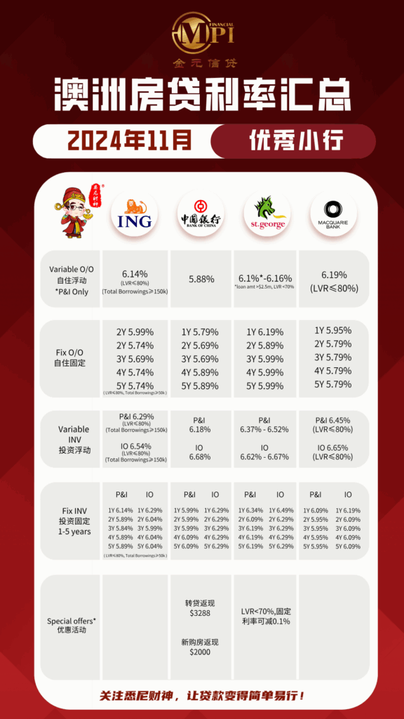 ▪ Macquarie Bank 的自住浮动利率为6.19%(LVR≤80%),固定利率2年3年定息为5.79%至5.79%,还是有很大的竞争力。