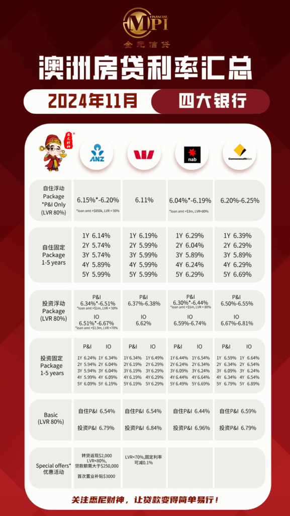 ▪ NAB 自住浮动利率为6.04%-6.19%,而固定利率则在6.29%至5.89%之间。3年固定利率有所下降