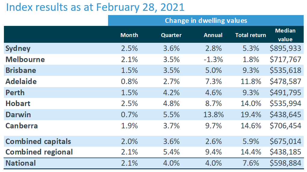 悉尼和霍巴特涨幅居前,这两个市场的住宅价格中值均增长了2.5%。墨尔本的住宅价值中值也增长了2.1%。