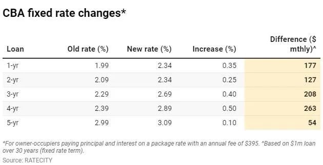 CBA宣布,自住房3年期固定利率上调了40个基点,至2.69%,而4年期固定利率上调了50个基点,至2.89%。