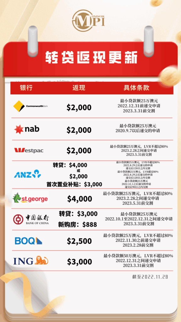 St George转贷补贴同为4000澳币,Nab  Westpac  CBA 同为2000澳币。