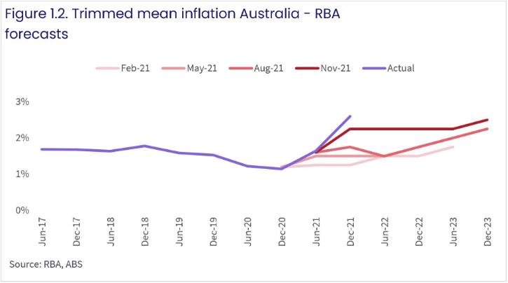 “切尾平均”通胀数据(剔除总体数据中波动最大的项)是基础通胀的一个重要指标。截至2021年12月的一年里,切尾平均通胀率为2.6%,比RBA的最新预测高出35个基点。