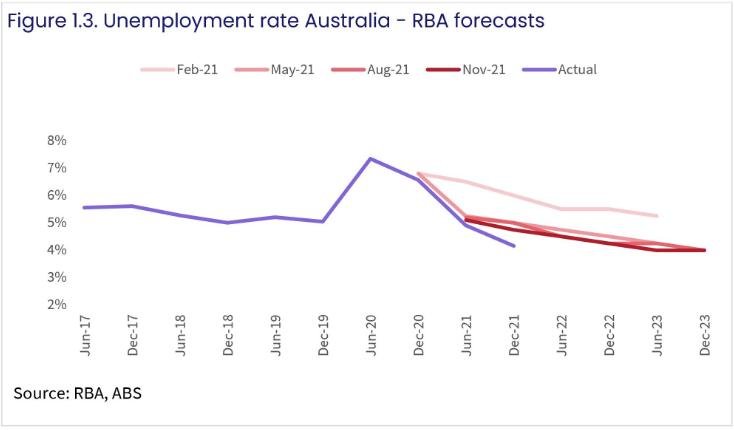 图1.1至1.3是ABS关于年度通胀、切尾平均通胀和失业率的数据,低失业率代表着工资和通胀的额外压力。图表对比了实际数据与RBA的预测数据。