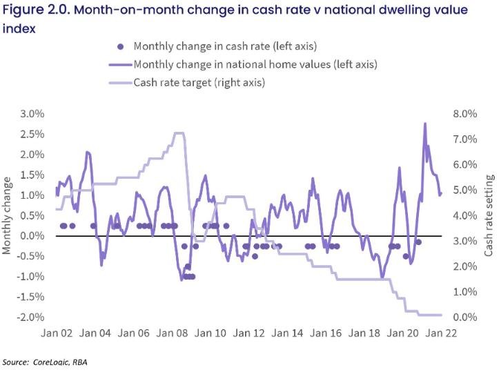 对2002年1月至2022年1月期间现金利率与全国CoreLogic住宅价值指数之间的相关性进行测验分析,结果显示负相关系数为84.7%。